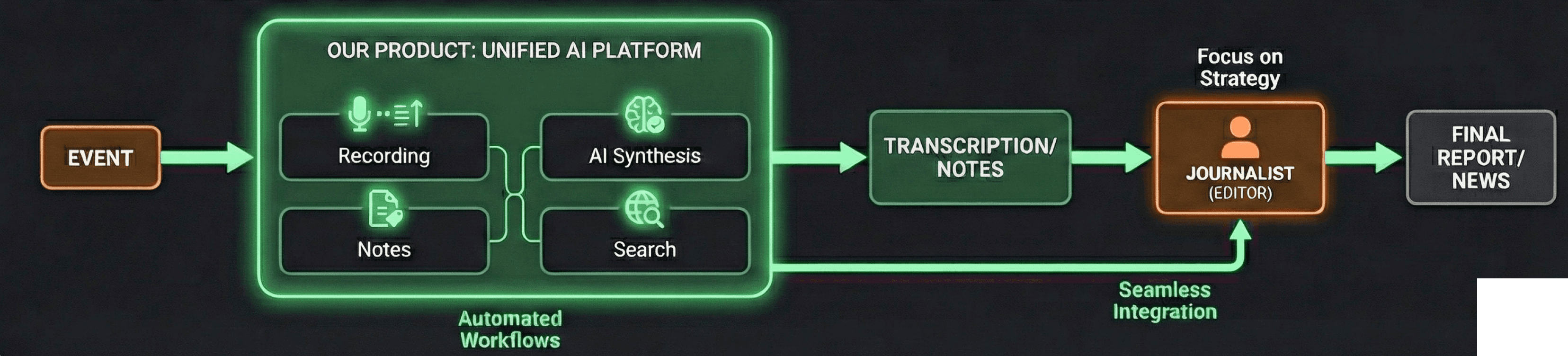 Every time the journalists switched apps to check a fact, they stopped listening. They were missing the live story because their tools were scattered.